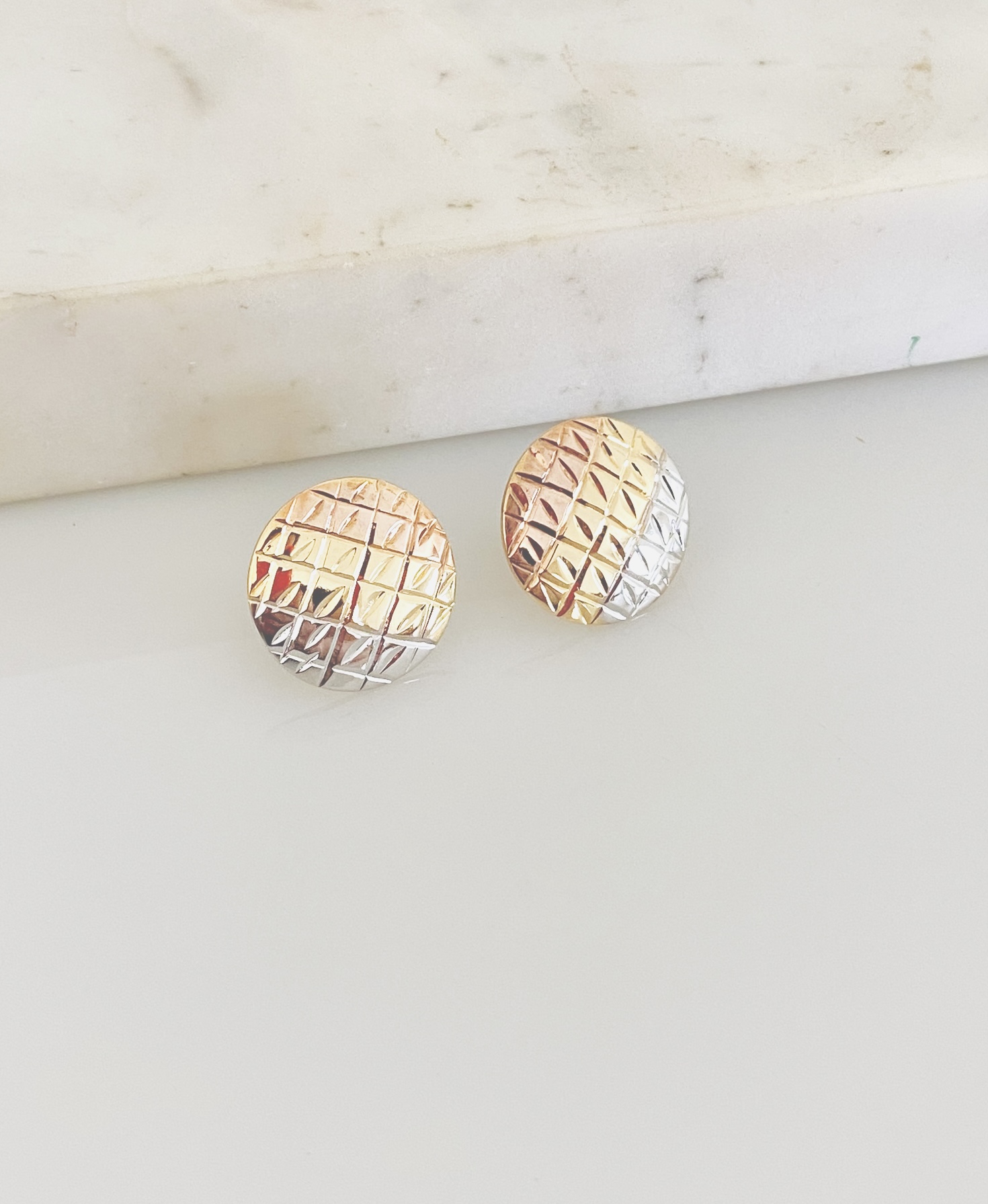 Descrição: Brinco redondo diamantando em banho de ouro e detalhe em três ouros 2cm
