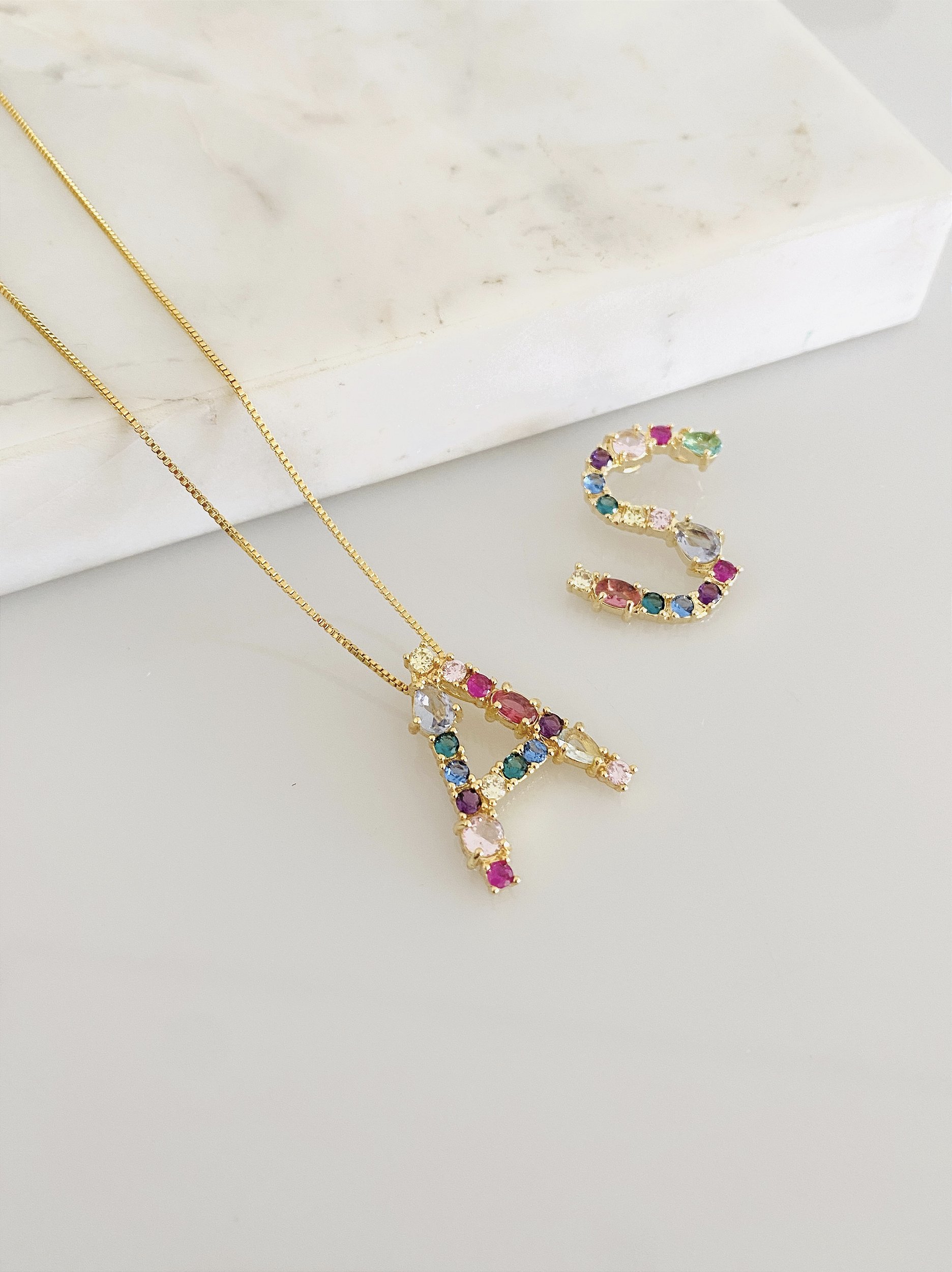 Descrição:Colar de letra cravejado em semijoia banhado a ouro com corrente de 45cm