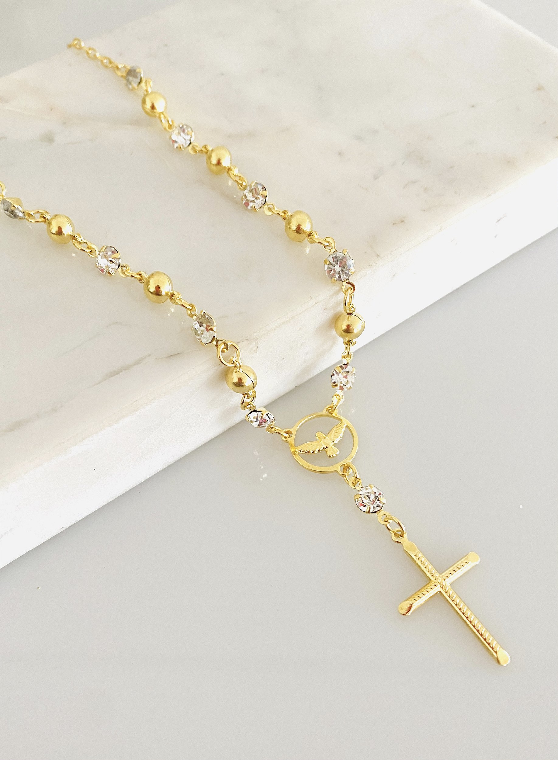 Descrição: Colar tercinho com com strass e bola oca com 45cm em semijoia banhado a ouro 18k