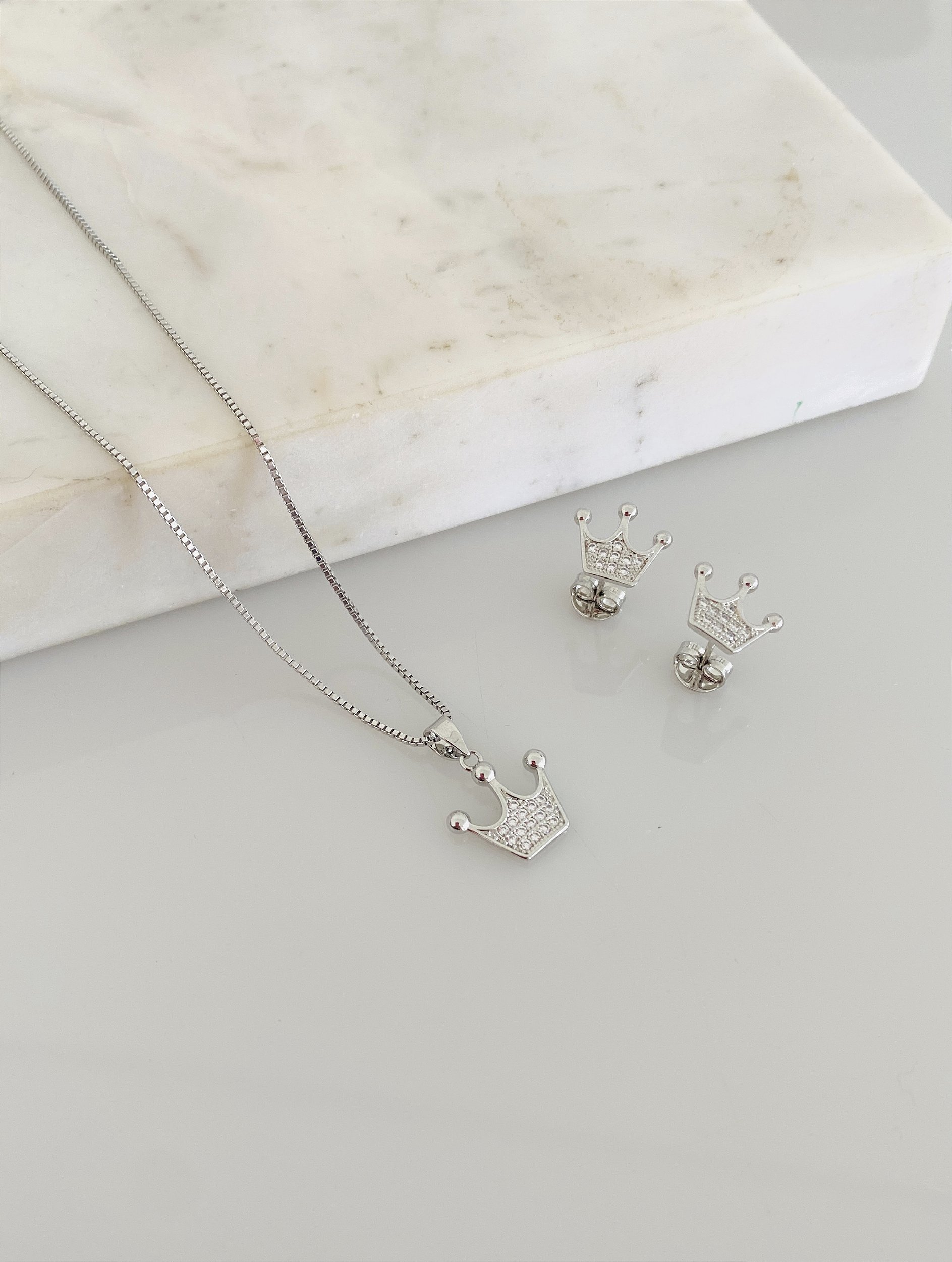 Descrição: Conjunto Coroa com pedras de zircônia cravejada em semijoia e corrente de 45cm