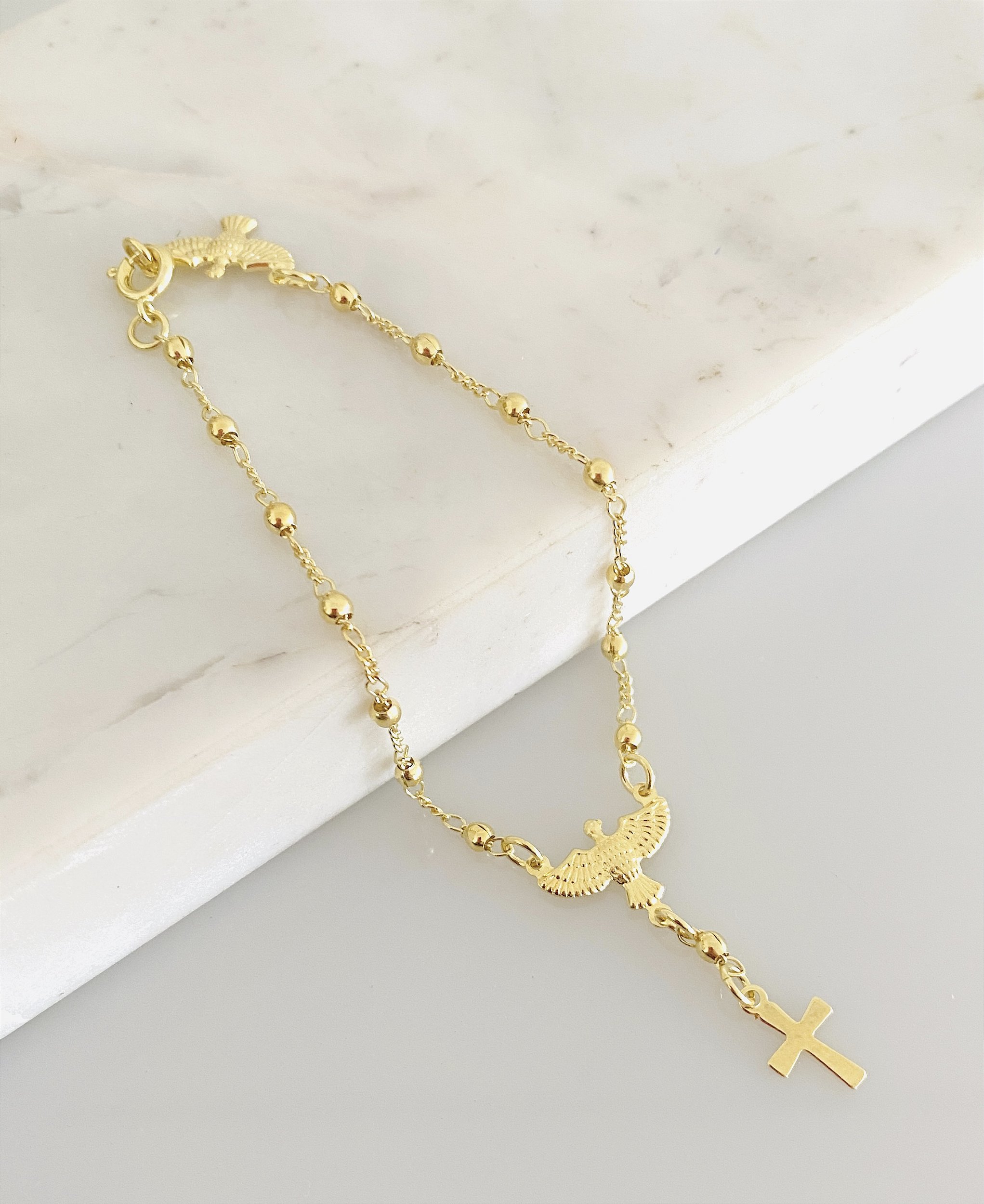 Descrição: Pulseira tercinho de bolinhas e Espírito Santo com 19cm.
