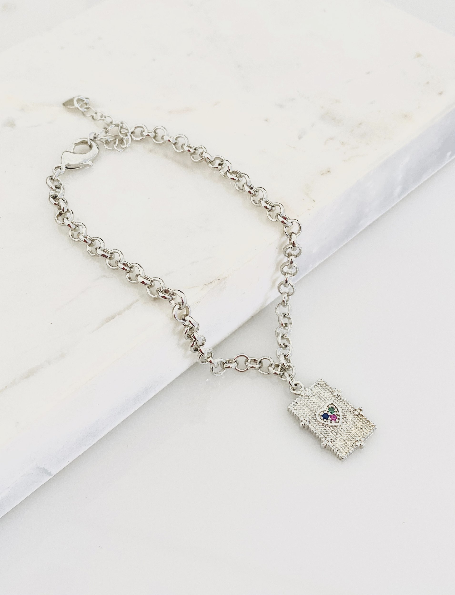 Descrição:Pulseira coração com corrente em elo portugues banhado a rôdio branco