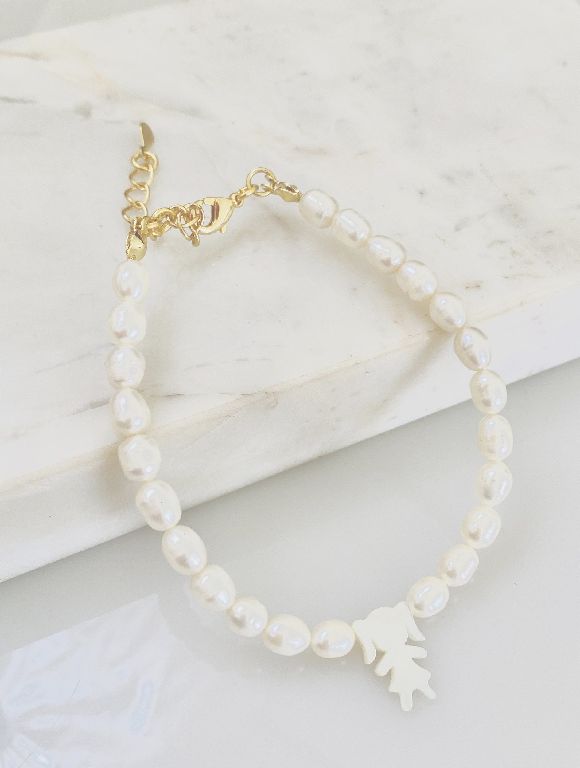 Descrição: Pulseira com pérola de agua doce e menina madrepérola em semijoia