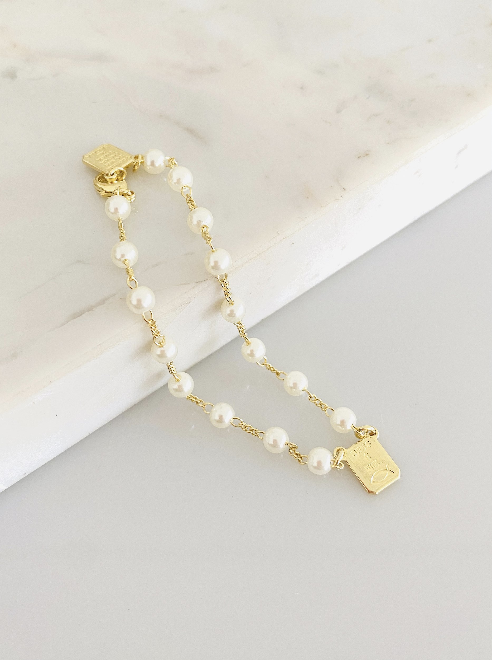 Descrição: Pulseira em pérola com Pai nosso de um lado e o Senhor é meu Pastor do outro, em pérola com 18cm banhado a ouro 18k.