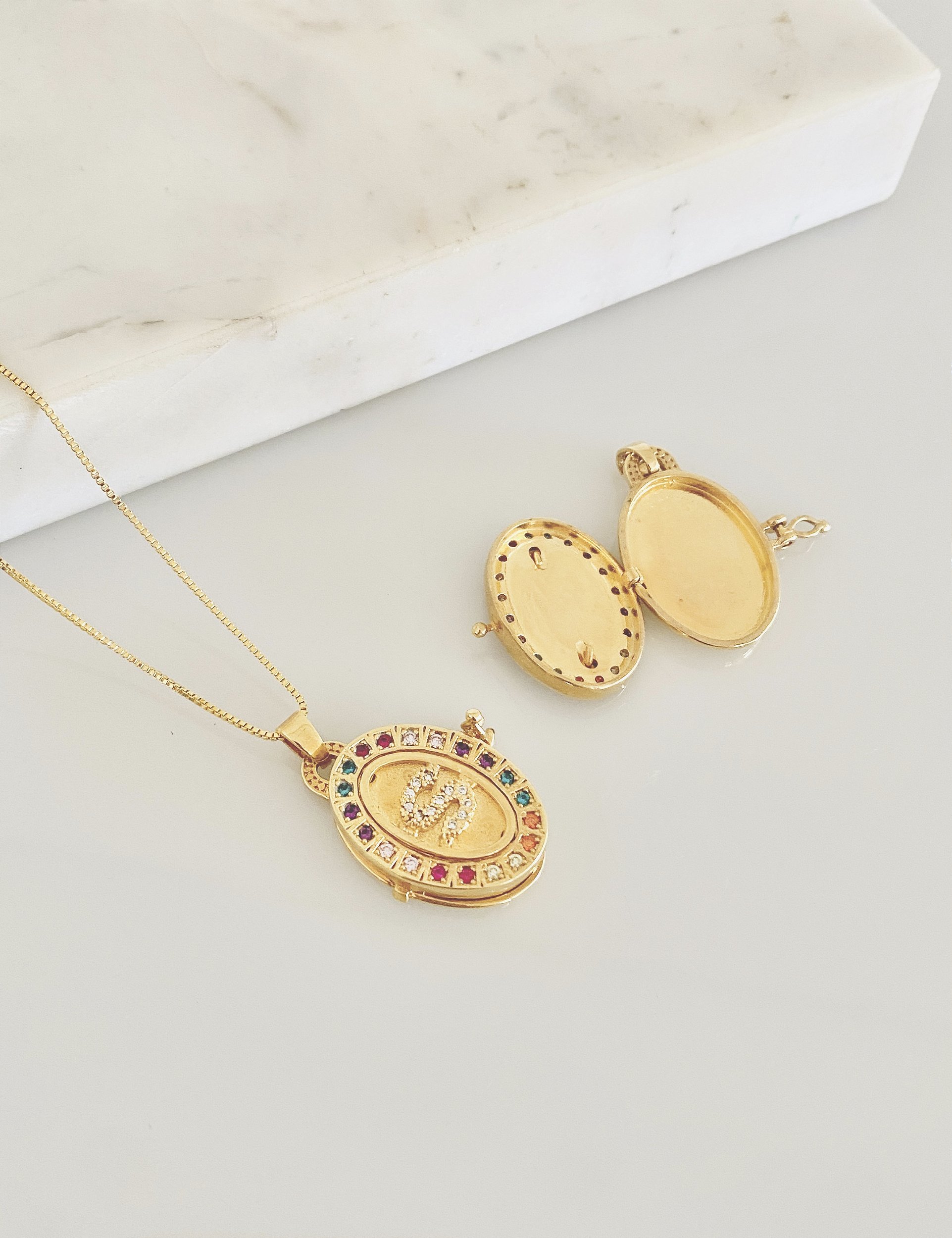 Descrição: Colar relicário com letra em semijoia e pedras de zircônia, acompanha corrente de 45cm